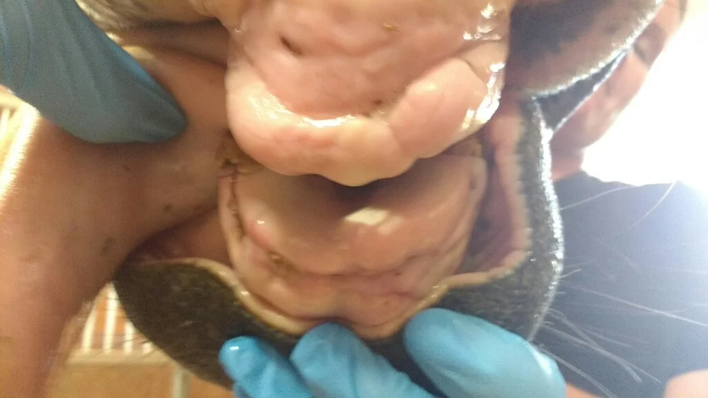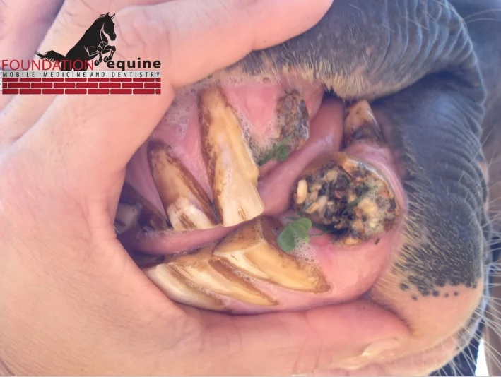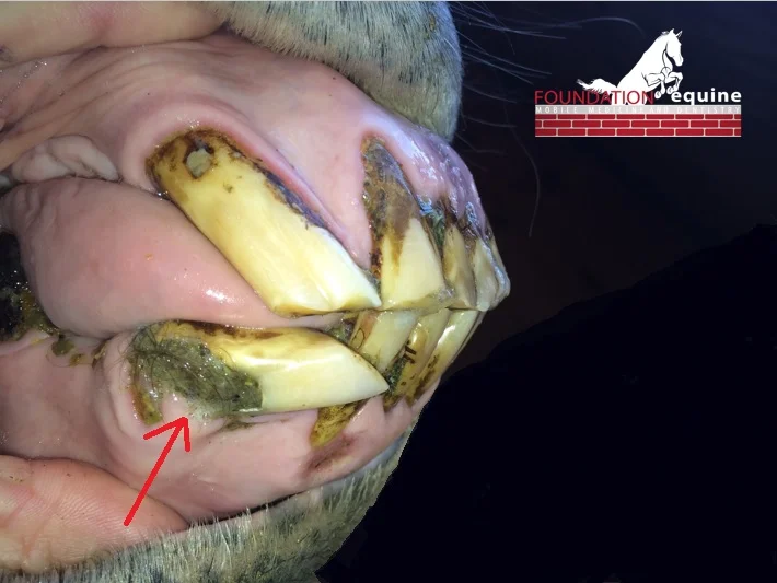 This is a severely-affected horse. Note the large, broken, infected incisor. Feed is actually collecting within the rotted remnant of the tooth. This horse was in tremendous pain.