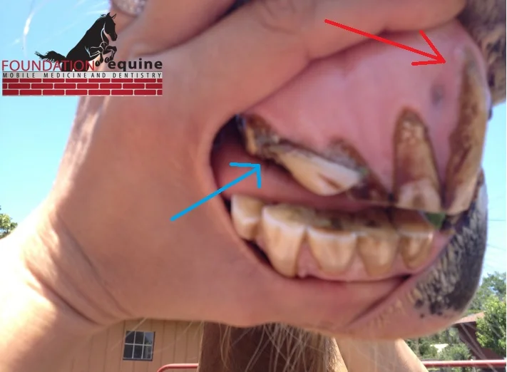 Another severely affected horse. The blue arrow points to a broken, "laid over" tooth and the red arrow points to a tooth with hypercementosis (note the bulging and amount of exposed tooth).