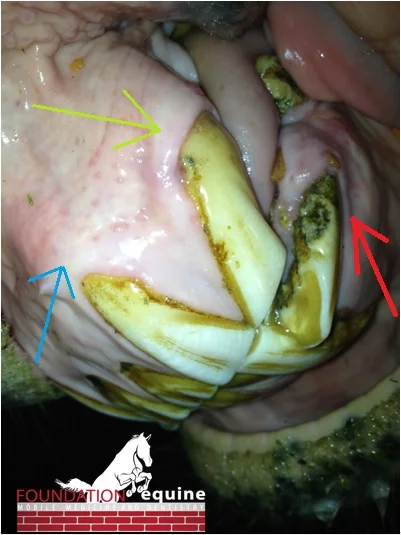 This horse has multiple symptoms of EOTRH. The red arrow points to a broken lower incisor and the green arrow points to severe gingival erosion. Both orange arrows point to thickened areas of the jaw.