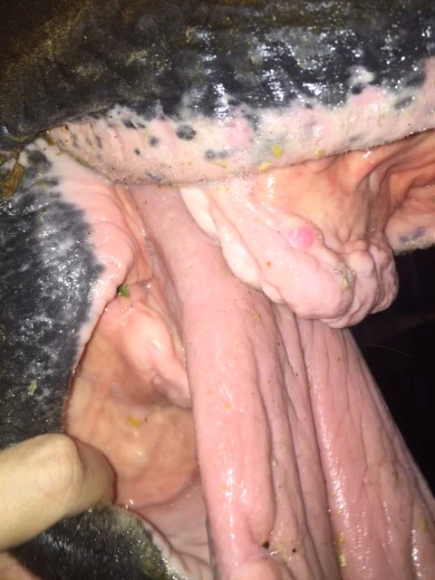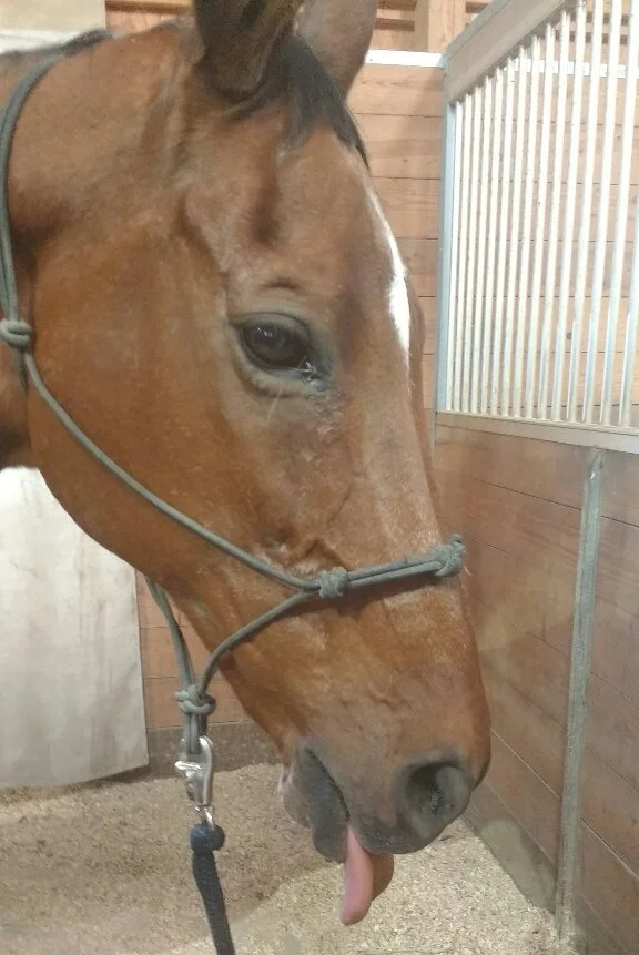 This is the same horse from the image above. He's fat and happy, but his tongue does hang out a bit! This is common in horses that have all their incisors removed.